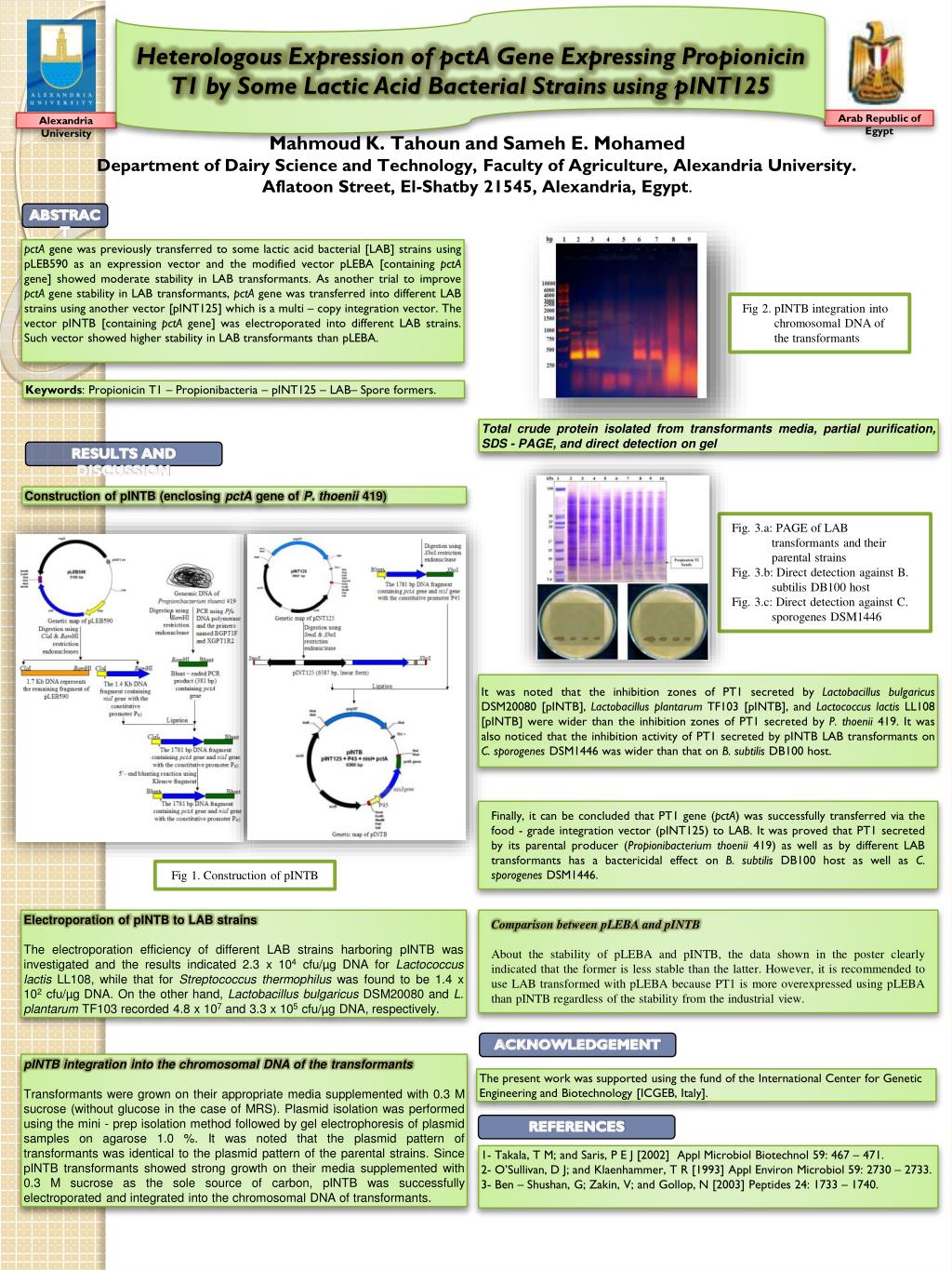 Heterologous Expression of pctA Gene Expressing Propionicin T1 by Some Lactic Acid Bacterial Strains using pINT125. Arab Republic of Egypt. Alexandria University. Mahmoud K. Tahoun and Sameh E. Mohamed