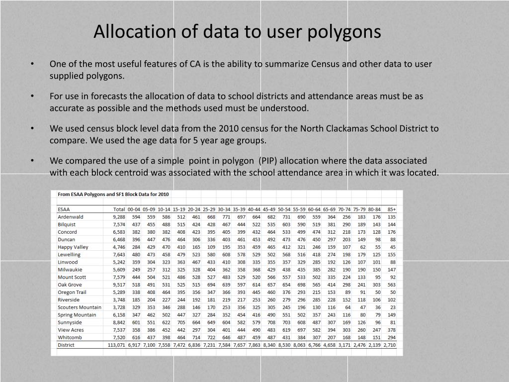 Allocation of data to user polygons • One of the most useful features of CA is the ability to summarize Census and other data to user supplied polygons. • For use in forecasts the allocation of data to school districts and attendance areas must be as accurate as possible and the methods used must be understood. • We used census block level data from the 2010 census for the North Clackamas School District to compare. We used the age data for 5 year age groups. • We compared the use of a simple point in polygon (PIP) allocation where the data associated with each block centroid was associated with the school attendance area in which it was located.