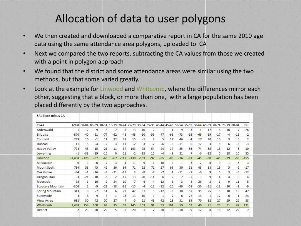 Allocation of data to user polygons • We then created and downloaded a comparative report in CA for the same 2010 age data using the same attendance area polygons, uploaded to CA • Next we compared the two reports, subtracting the CA values from those we created with a point in polygon approach • We found that the district and some attendance areas were similar using the two methods, but that some varied greatly. • Look at the example for Linwood and Whitcomb, where the differences mirror each other, suggesting that a block, or more than one, with a large population has been placed differently by the two approaches.