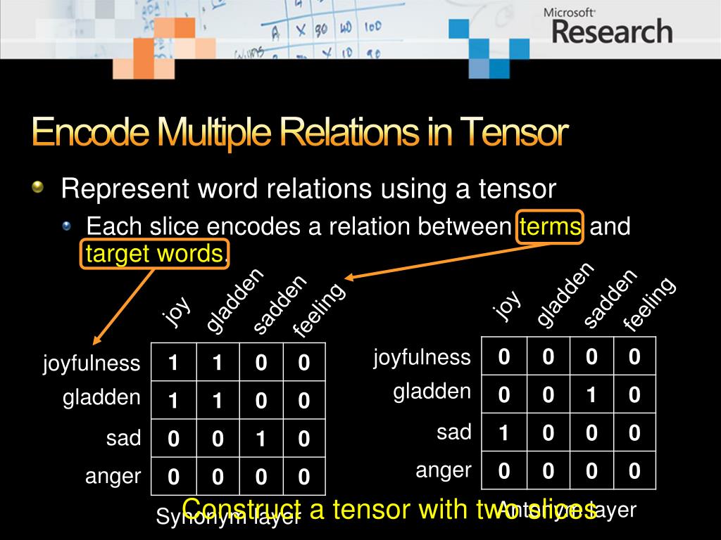 Encode Multiple Relations in Tensor • Represent word relations using a tensor • Each slice encodes a relation between terms and target words. gladden sadden gladden joy feeling sadden joy feeling joyfulness joyfulness gladden gladden sad sad anger anger Construct a tensor with two slices Antonym layer Synonym layer