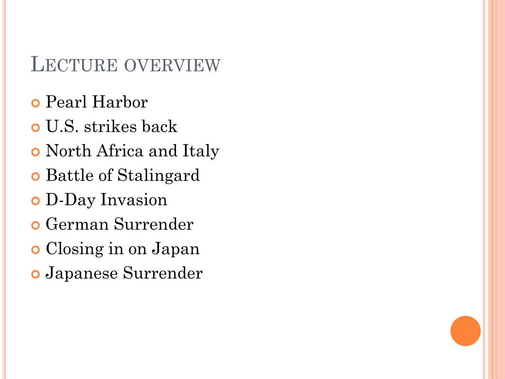 Lecture overview • Pearl Harbor • U.S. strikes back • North Africa and Italy • Battle of Stalingard • D-Day Invasion • German Surrender • Closing in on Japan • Japanese Surrender