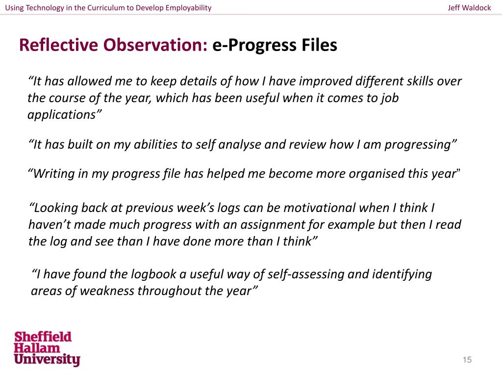 Using Technology in the Curriculum to Develop Employability Jeff Waldock Reflective Observation: e-Progress Files “It has allowed me to keep details of how I have improved different skills over the course of the year, which has been useful when it comes to job applications” “It has built on my abilities to self analyse and review how I am progressing” “Writing in my progress file has helped me become more organised this year” “Looking back at previous week’s logs can be motivational when I think I haven’t made much progress with an assignment for example but then I read the log and see than I have done more than I think” “I have found the logbook a useful way of self-assessing and identifying areas of weakness throughout the year”