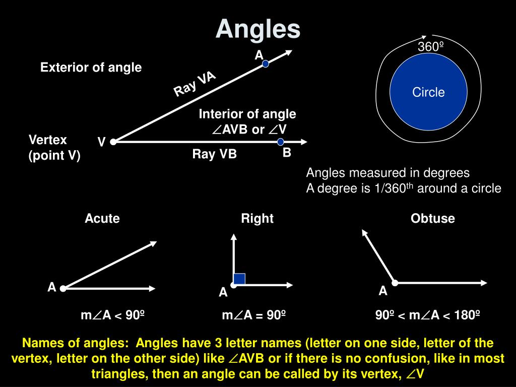 Angles 360º A Circle Exterior of angle Ray VA Interior of angle AVB or V Vertex (point V) V B Ray VB Angles measured in degrees A degree is 1/360th around a circle Acute Right Obtuse A A A mA < 90º mA = 90º 90º < mA < 180º Names of angles: Angles have 3 letter names (letter on one side, letter of the vertex, letter on the other side) like AVB or if there is no confusion, like in most triangles, then an angle can be called by its vertex, V
