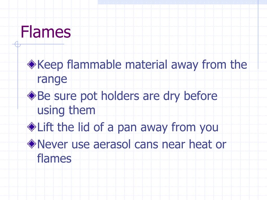 Flames • Keep flammable material away from the range • Be sure pot holders are dry before using them • Lift the lid of a pan away from you • Never use aerasol cans near heat or flames