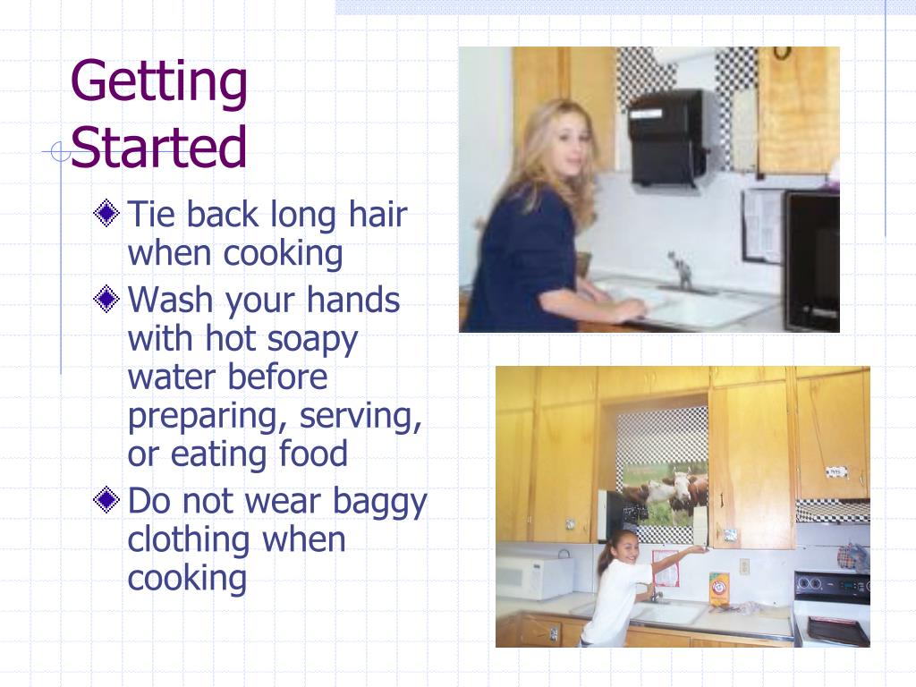 Getting Started • Tie back long hair when cooking • Wash your hands with hot soapy water before preparing, serving, or eating food • Do not wear baggy clothing when cooking