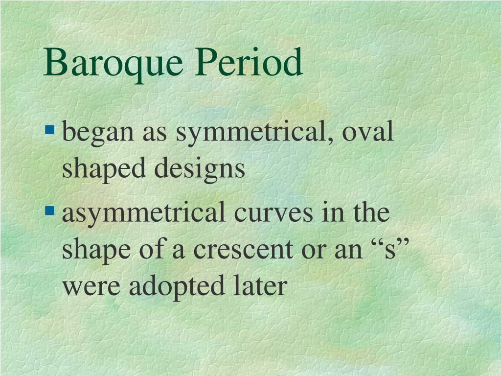 Baroque Period • began as symmetrical, oval shaped designs • asymmetrical curves in the shape of a crescent or an “s” were adopted later