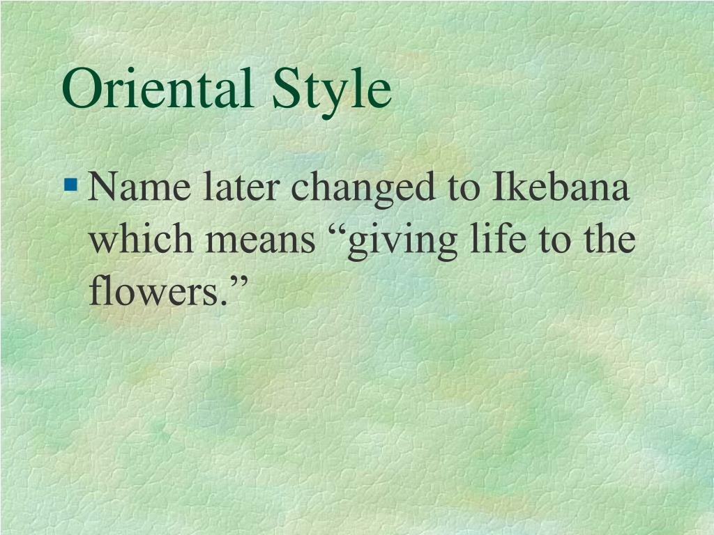 Oriental Style • Sixth Century A.D. Japanese adopted many aspects of the Chinese culture, including floral arrangement. • Japanese priest named Ikenabo refined the art.