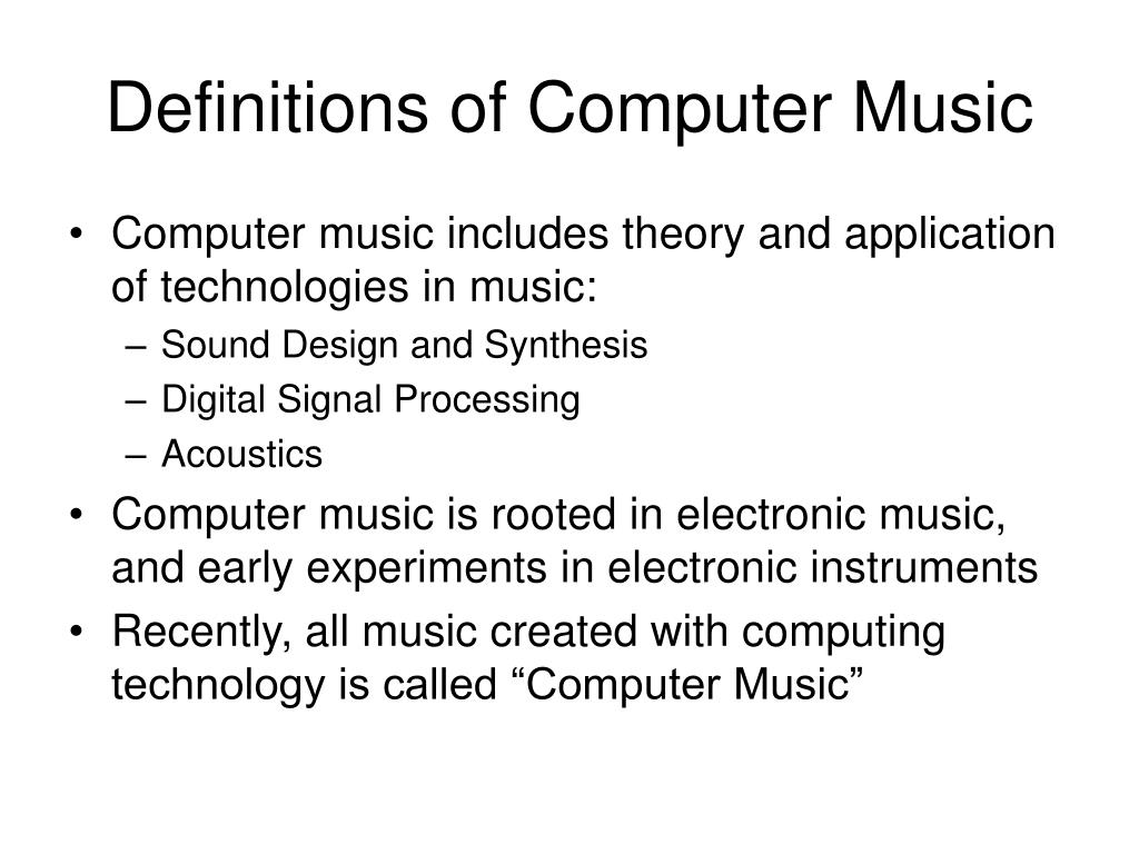 Definitions of Computer Music • Computer music includes theory and application of technologies in music: • Sound Design and Synthesis • Digital Signal Processing • Acoustics • Computer music is rooted in electronic music, and early experiments in electronic instruments • Recently, all music created with computing technology is called “Computer Music”