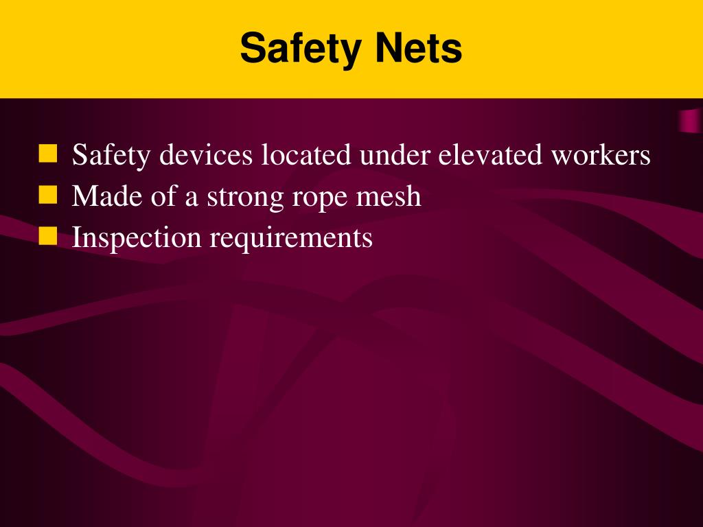 Safety Nets • Safety devices located under elevated workers • Made of a strong rope mesh • Inspection requirements
