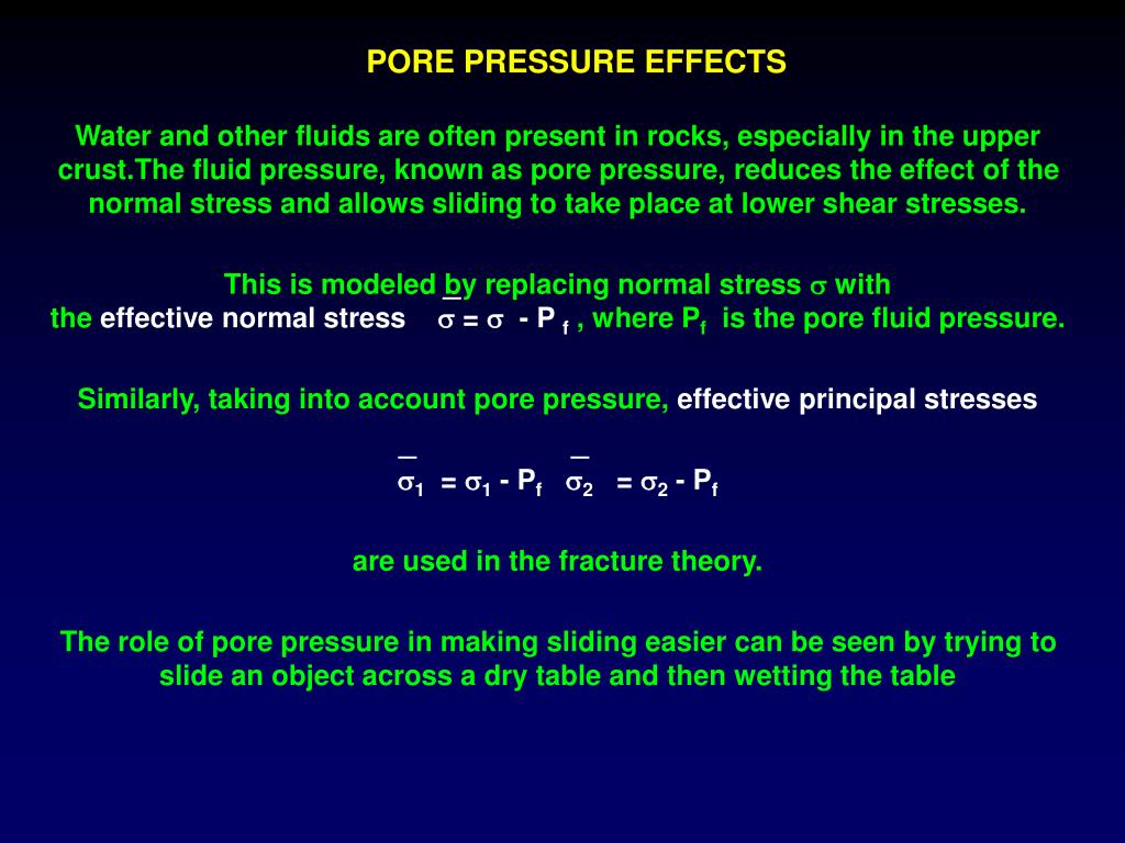 PORE PRESSURE EFFECTS _ Water and other fluids are often present in rocks, especially in the upper crust.The fluid pressure, known as pore pressure, reduces the effect of the normal stress and allows sliding to take place at lower shear stresses. This is modeled by replacing normal stress with the effective normal stress = - P f , where Pf is the pore fluid pressure. Similarly, taking into account pore pressure, effective principal stresses 1 = 1 - Pf2 = 2 - Pf are used in the fracture theory. The role of pore pressure in making sliding easier can be seen by trying to slide an object across a dry table and then wetting the table _ _