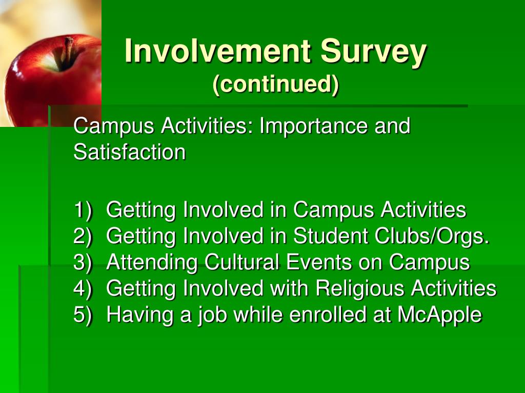 Involvement Survey(continued) Social Involvement: Importance and Satisfaction: Rate how important each of the following items are to you at McApple College by selecting the response that best describes your feelings. Secondly, rate how satisfied you were each item at McApple College by selecting the item that best describes your feelings. 1) McAppleSauce was helpful in meeting new people on campus 2) McAppleSauce helped establish personal relationships 3) McAppleSauce exposed me to people of other backgrounds 4) McAppleSauce connected me with international students