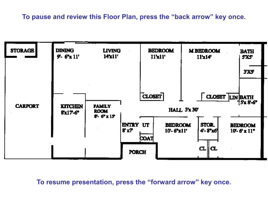 To pause and review this Floor Plan, press the “back arrow” key once. To resume presentation, press the “forward arrow” key once.