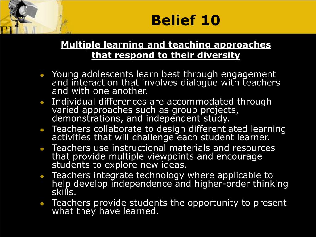 Belief 10 Multiple learning and teaching approaches that respond to their diversity • Young adolescents learn best through engagement and interaction that involves dialogue with teachers and with one another. • Individual differences are accommodated through varied approaches such as group projects, demonstrations, and independent study. • Teachers collaborate to design differentiated learning activities that will challenge each student learner. • Teachers use instructional materials and resources that provide multiple viewpoints and encourage students to explore new ideas. • Teachers integrate technology where applicable to help develop independence and higher-order thinking skills. • Teachers provide students the opportunity to present what they have learned.