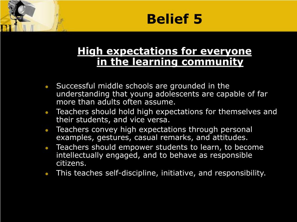 Belief 5 High expectations for everyone in the learning community • Successful middle schools are grounded in the understanding that young adolescents are capable of far more than adults often assume. • Teachers should hold high expectations for themselves and their students, and vice versa. • Teachers convey high expectations through personal examples, gestures, casual remarks, and attitudes. • Teachers should empower students to learn, to become intellectually engaged, and to behave as responsible citizens. • This teaches self-discipline, initiative, and responsibility.