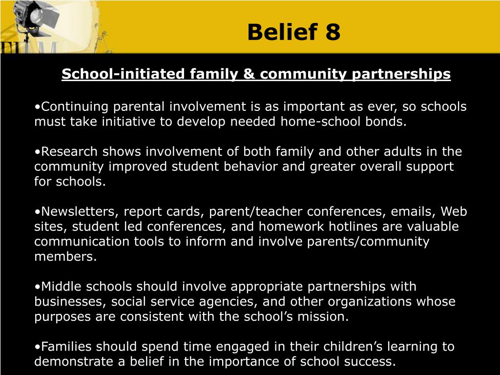 Belief 8 School-initiated family & community partnerships • Continuing parental involvement is as important as ever, so schools must take initiative to develop needed home-school bonds. • Research shows involvement of both family and other adults in the community improved student behavior and greater overall support for schools. • Newsletters, report cards, parent/teacher conferences, emails, Web sites, student led conferences, and homework hotlines are valuable communication tools to inform and involve parents/community members. • Middle schools should involve appropriate partnerships with businesses, social service agencies, and other organizations whose purposes are consistent with the school’s mission. • Families should spend time engaged in their children’s learning to demonstrate a belief in the importance of school success.