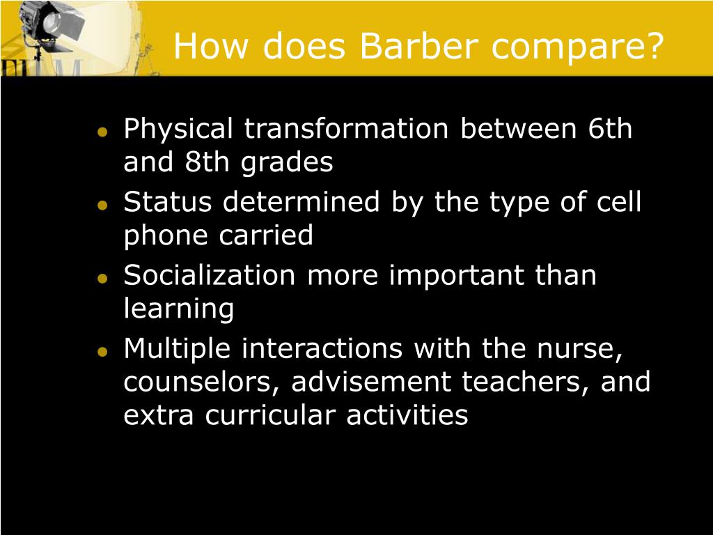 How does Barber compare? • Physical transformation between 6th and 8th grades • Status determined by the type of cell phone carried • Socialization more important than learning • Multiple interactions with the nurse, counselors, advisement teachers, and extra curricular activities