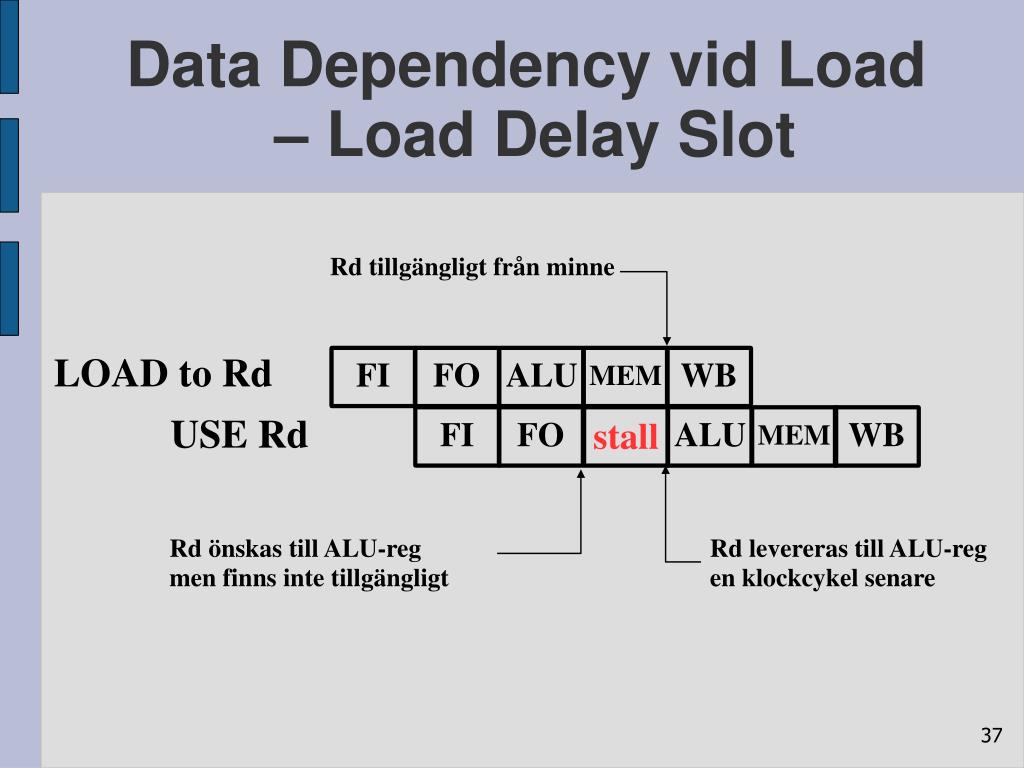 FI FO ALU WB MEM FI FO stall ALU WB MEM Data Dependency vid Load – Load Delay Slot Rd tillgängligt från minne LOAD to Rd USE Rd Rd önskas till ALU-reg men finns inte tillgängligt Rd levereras till ALU-reg en klockcykel senare