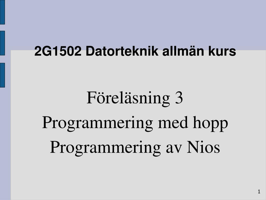 Föreläsning 3 Programmering med hopp Programmering av Nios 2G1502 Datorteknik allmän kurs
