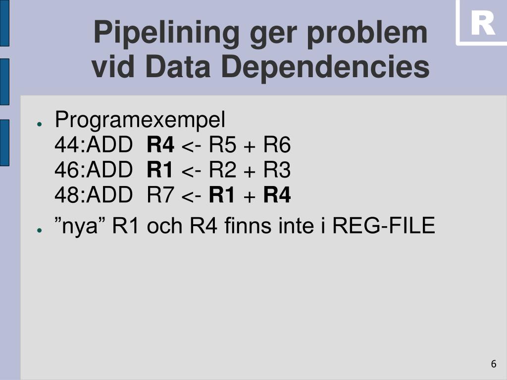 R Pipelining ger problem vid Data Dependencies • Programexempel44: ADD R4 <- R5 + R6 46: ADD R1 <- R2 + R3 48: ADD R7 <- R1 + R4 • ”nya” R1 och R4 finns inte i REG-FILE