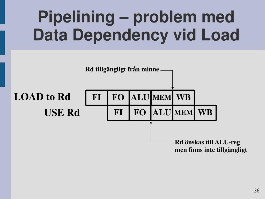 FI FO ALU WB MEM FI FO ALU WB MEM Pipelining – problem med Data Dependency vid Load Rd tillgängligt från minne LOAD to Rd USE Rd Rd önskas till ALU-reg men finns inte tillgängligt