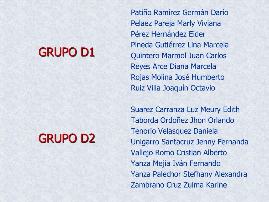 GRUPO D1 GRUPO D2 Patiño Ramírez Germán Darío Pelaez Pareja Marly Viviana Pérez Hernández Eider Pineda Gutiérrez Lina Marcela Quintero Marmol Juan Carlos Reyes Arce Diana Marcela Rojas Molina José Humberto Ruiz Villa Joaquín Octavio Suarez Carranza Luz Meury Edith Taborda Ordoñez Jhon Orlando Tenorio Velasquez Daniela Unigarro Santacruz Jenny Fernanda Vallejo Romo Cristian Alberto Yanza Mejía Iván Fernando Yanza Palechor Stefhany Alexandra Zambrano Cruz Zulma Karine