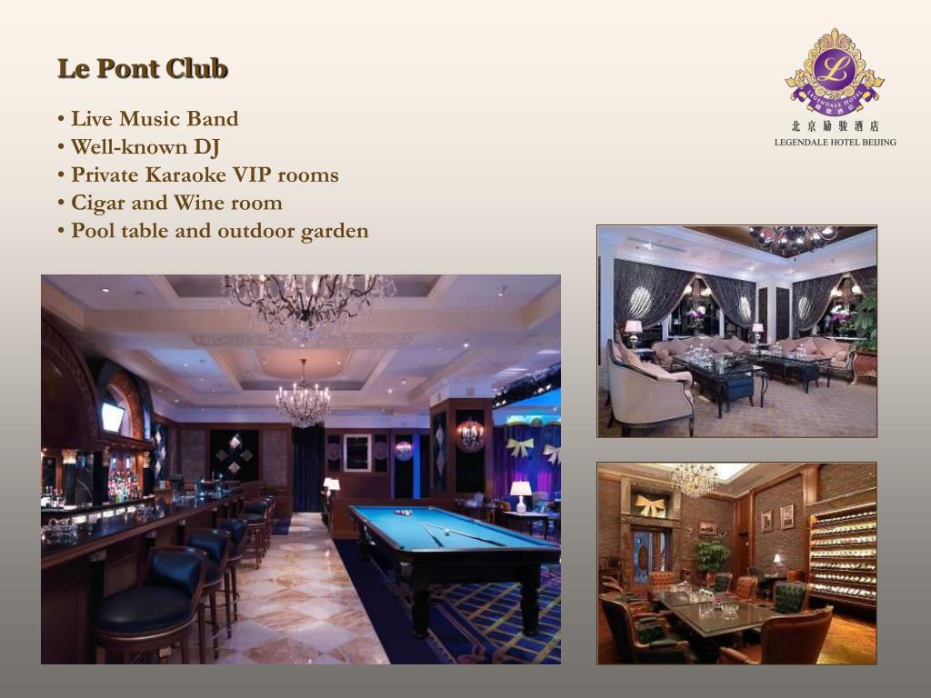 Le Pont Club • Live Music Band • Well-known DJ • Private Karaoke VIP rooms • Cigar and Wine room • Pool table and outdoor garden