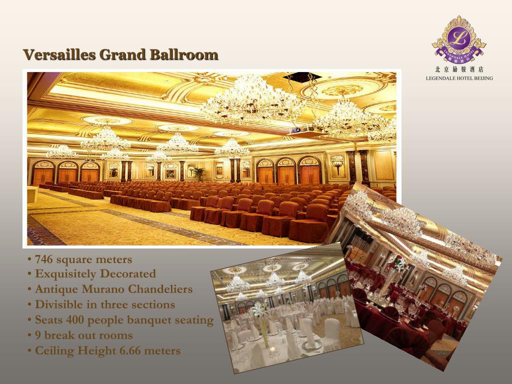 Versailles Grand Ballroom • 746 square meters • Exquisitely Decorated • Antique Murano Chandeliers • Divisible in three sections • Seats 400 people banquet seating • 9 break out rooms • Ceiling Height 6.66 meters