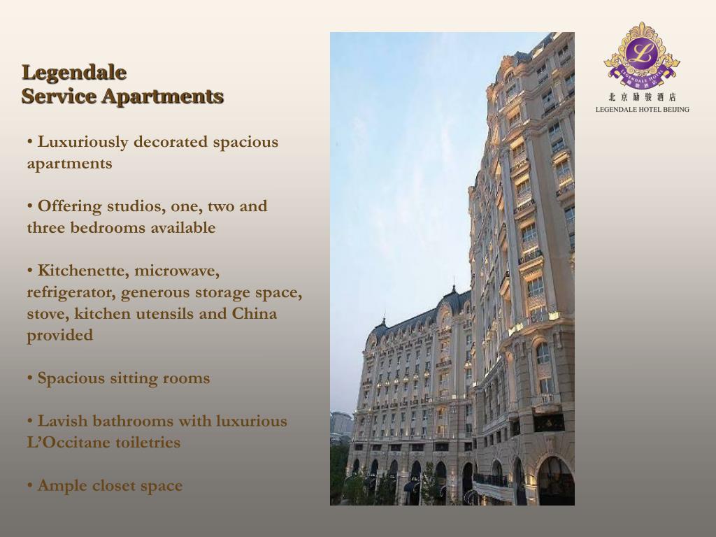 Legendale Service Apartments • Luxuriously decorated spacious apartments • Offering studios, one, two and three bedrooms available • Kitchenette, microwave, refrigerator, generous storage space, stove, kitchen utensils and China provided • Spacious sitting rooms • Lavish bathrooms with luxurious L’Occitane toiletries • Ample closet space