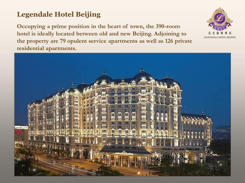 LEGENDALE HOTEL BEIJING. Legendale Hotel Beijing. Occupying a prime position in the heart of town, the 390-room hotel is ideally located between old and new Beijing. Adjoining to the property are 79 opulent service apartments as well as 126 private residential apartments. Ideal Location.