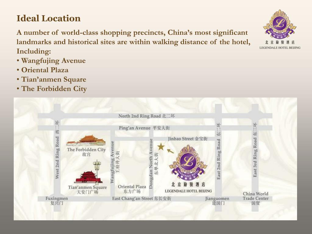 Ideal Location • A number of world-class shopping precincts, China’s most significant landmarks and historical sites are within walking distance of the hotel, • Including: • Wangfujing Avenue • Oriental Plaza • Tian’anmen Square • The Forbidden City