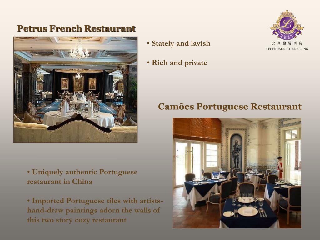 Petrus French Restaurant • Stately and lavish • Rich and private Camões Portuguese Restaurant • Uniquely authentic Portuguese restaurant in China • Imported Portuguese tiles with artists-hand-draw paintings adorn the walls of this two story cozy restaurant