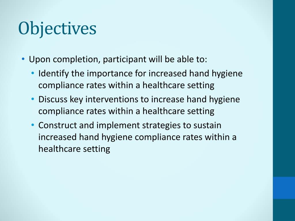 Objectives • Upon completion, participant will be able to: • Identify the importance for increased hand hygiene compliance rates within a healthcare setting • Discuss key interventions to increase hand hygiene compliance rates within a healthcare setting • Construct and implement strategies to sustain increased hand hygiene compliance rates within a healthcare setting