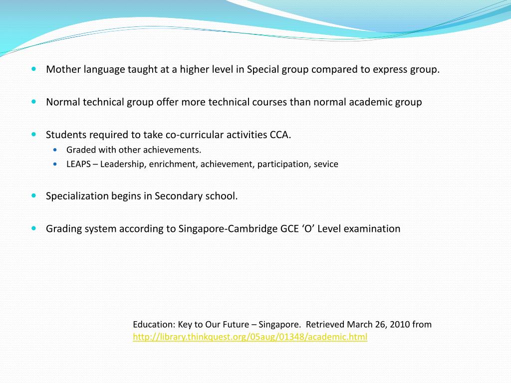Mother language taught at a higher level in Special group compared to express group. • Normal technical group offer more technical courses than normal academic group • Students required to take co-curricular activities CCA. • Graded with other achievements. • LEAPS – Leadership, enrichment, achievement, participation, sevice • Specialization begins in Secondary school. • Grading system according to Singapore-Cambridge GCE ‘O’ Level examination Education: Key to Our Future – Singapore. Retrieved March 26, 2010 from http://library.thinkquest.org/05aug/01348/academic.html