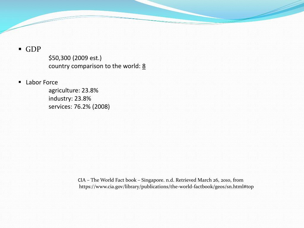 GDP • $50,300 (2009 est.) • country comparison to the world: 8 • Labor Force • agriculture: 23.8% • industry: 23.8% • services: 76.2% (2008) • CIA – The World Fact book – Singapore. n.d. Retrieved March 26, 2010, from https://www.cia.gov/library/publications/the-world-factbook/geos/sn.html#top