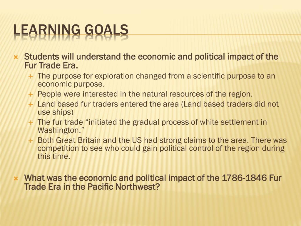 Students will understand the economic and political impact of the Fur Trade Era. • The purpose for exploration changed from a scientific purpose to an economic purpose. • People were interested in the natural resources of the region. • Land based fur traders entered the area (Land based traders did not use ships) • The fur trade “initiated the gradual process of white settlement in Washington.” • Both Great Britain and the US had strong claims to the area. There was competition to see who could gain political control of the region during this time. • What was the economic and political impact of the 1786-1846 Fur Trade Era in the Pacific Northwest? Learning Goals