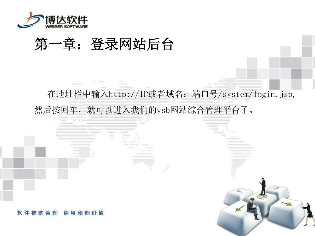 VSB9 网站群管理平台 内容维护. 本讲主要内容: 1. 如何登陆网站后台 2. 基础信息修改 3. 网站文章类型资料更新 4. 网站图片类型资料更新 5. 网站链接类型资料更新. 本讲主要目的: 在结束本讲内容之后,能够按照客户的需求对网站的资料进行实时更新操作。. 第一章:登录网站后台 在地址栏中输入 http://IP 或者域名:端口号 /system/login.jsp, 然后按回车,就可以进入我们的 vsb 网站综合管理平台了。.