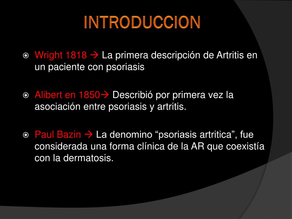 INTRODUCCION • Wright 1818 La primera descripción de Artritis en un paciente con psoriasis • Alibert en 1850 Describió por primera vez la asociación entre psoriasis y artritis. • Paul Bazin La denomino “psoriasis artritica”, fue considerada una forma clínica de la AR que coexistía con la dermatosis.