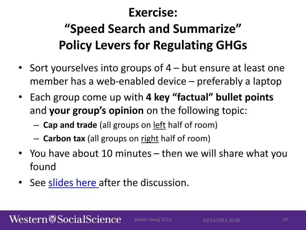 Exercise:“Speed Search and Summarize”Policy Levers for Regulating GHGs • Sort yourselves into groups of 4 – but ensure at least one member has a web-enabled device – preferably a laptop • Each group come up with 4 key “factual” bullet points and your group’s opinion on the following topic: • Cap and trade (all groups on left half of room) • Carbon tax (all groups on right half of room) • You have about 10 minutes – then we will share what you found • See slides here after the discussion. Baxter Geog 2153