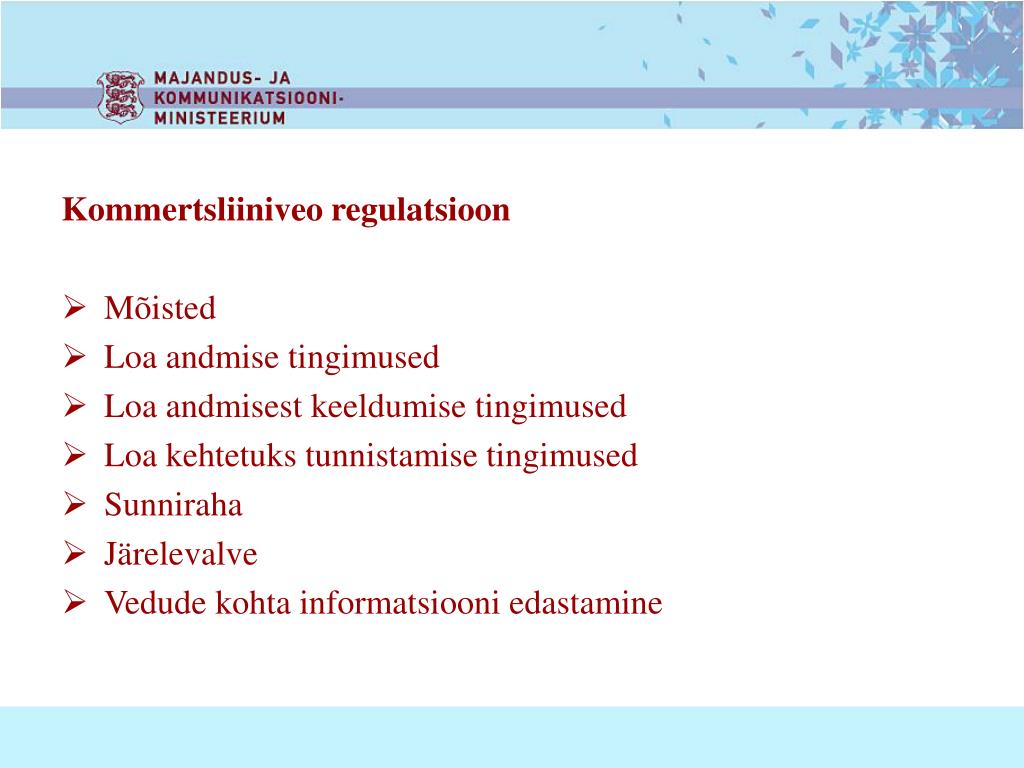 Kommertsliiniveo regulatsioon. Priit Vene Majandus- ja Kommunikatsiooniministeerium. Kommertsliiniveo regulatsioon Mõisted Loa andmise tingimused Loa andmisest keeldumise tingimused Loa kehtetuks tunnistamise tingimused Sunniraha Järelevalve Vedude kohta informatsiooni edastamine.