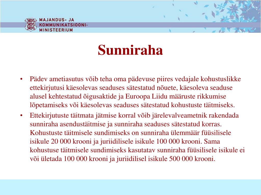 Sunniraha • Pädev ametiasutus võib teha oma pädevuse piires vedajale kohustuslikke ettekirjutusi käesolevas seaduses sätestatud nõuete, käesoleva seaduse alusel kehtestatud õigusaktide ja Euroopa Liidu määruste rikkumise lõpetamiseks või käesolevas seaduses sätestatud kohustuste täitmiseks. • Ettekirjutuste täitmata jätmise korral võib järelevalveametnik rakendada sunniraha asendustäitmise ja sunniraha seaduses sätestatud korras. Kohustuste täitmisele sundimiseks on sunniraha ülemmäär füüsilisele isikule 20 000 krooni ja juriidilisele isikule 100 000 krooni. Sama kohustuse täitmisele sundimiseks kasutatav sunniraha füüsilisele isikule ei või ületada 100 000 krooni ja juriidilisel isikule 500 000 krooni.