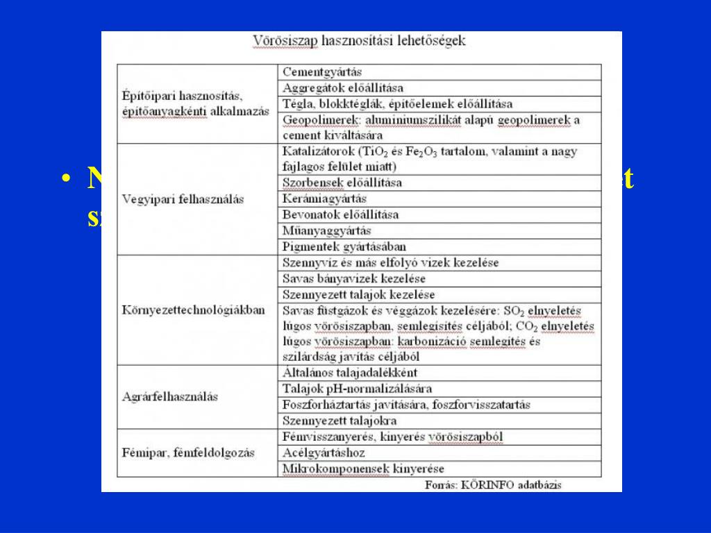 A vörösiszap a Bayer timföldgyártás mellékterméke. Magas pH értéken az alumínium nátrium sója (Na3AlO3) kioldódik a vörösiszap mellől. A visszamaradt vörösiszap összetétele: Mi a vörösiszap A nyomnyi nehézfémek lúgos oldatban nem oldódnak fel.