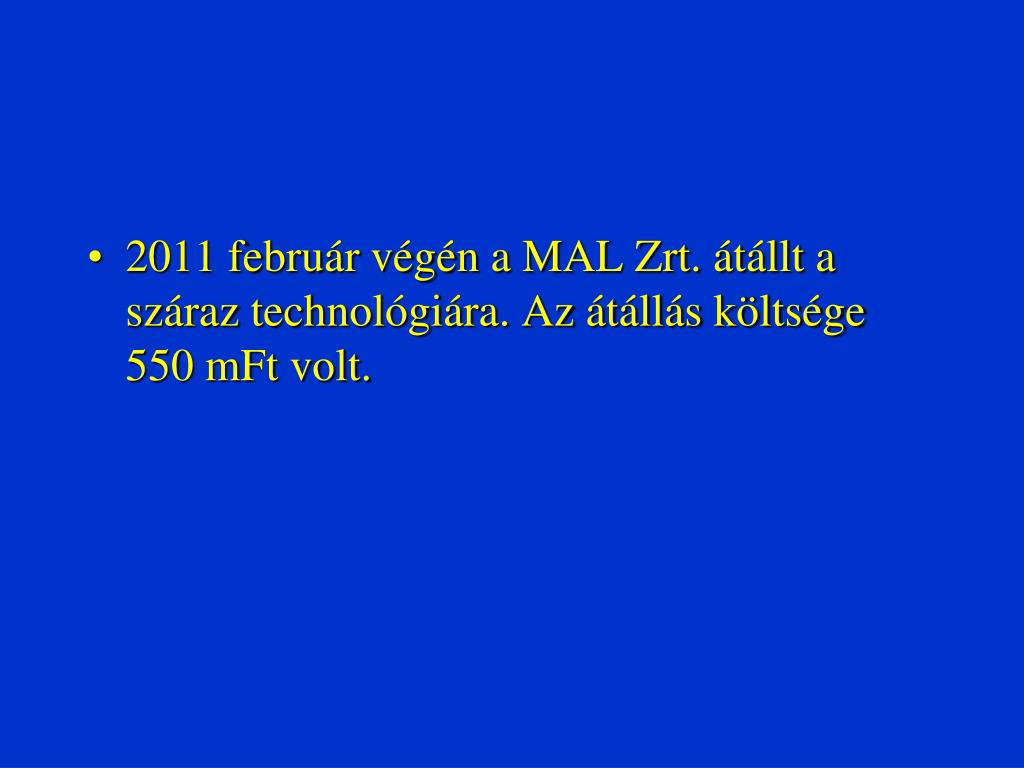 2011 február végén a MAL Zrt. átállt a száraz technológiára. Az átállás költsége 550 mFt volt.