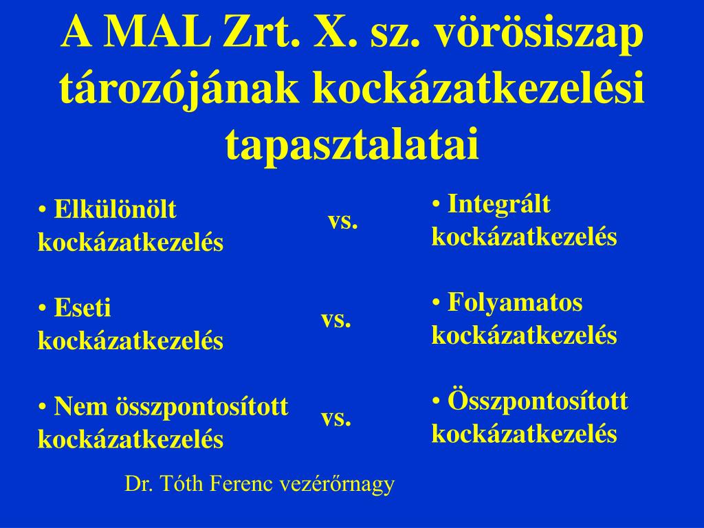A MAL Zrt. X. sz. vörösiszap tározójának kockázatkezelési tapasztalatai • Integrált • kockázatkezelés • Folyamatos • kockázatkezelés • Összpontosított • kockázatkezelés • Elkülönölt • kockázatkezelés • Eseti • kockázatkezelés • Nem összpontosított • kockázatkezelés vs. vs. vs. Dr. Tóth Ferenc vezérőrnagy