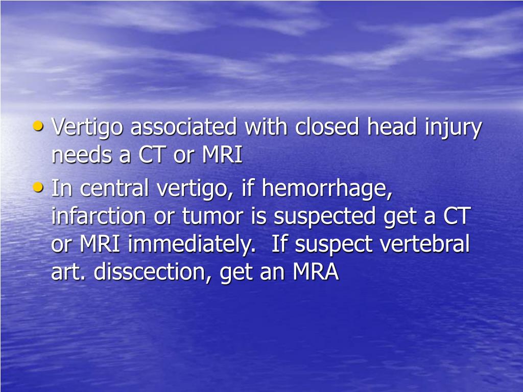 Vertigo associated with closed head injury needs a CT or MRI • In central vertigo, if hemorrhage, infarction or tumor is suspected get a CT or MRI immediately. If suspect vertebral art. disscection, get an MRA