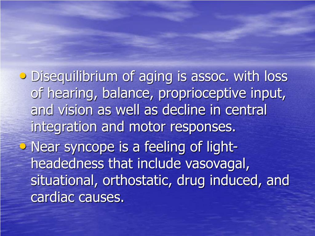 Disequilibrium of aging is assoc. with loss of hearing, balance, proprioceptive input, and vision as well as decline in central integration and motor responses. • Near syncope is a feeling of light-headedness that include vasovagal, situational, orthostatic, drug induced, and cardiac causes.
