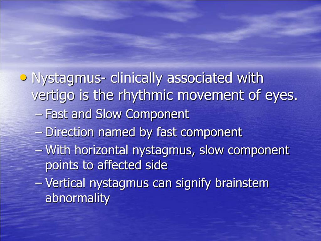 Nystagmus- clinically associated with vertigo is the rhythmic movement of eyes. • Fast and Slow Component • Direction named by fast component • With horizontal nystagmus, slow component points to affected side • Vertical nystagmus can signify brainstem abnormality