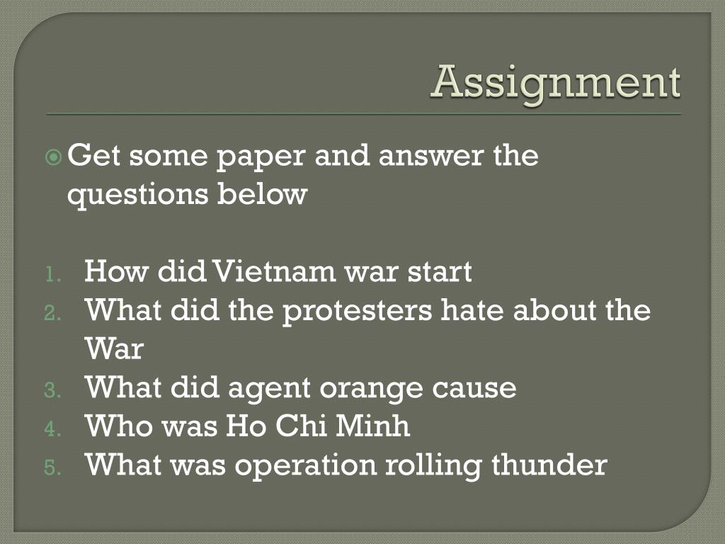 Assignment Get some paper and answer the questions below How did Vietnam war start What did the protesters hate about the War What did agent orange cause Who was Ho Chi Minh What was operation rolling thunder