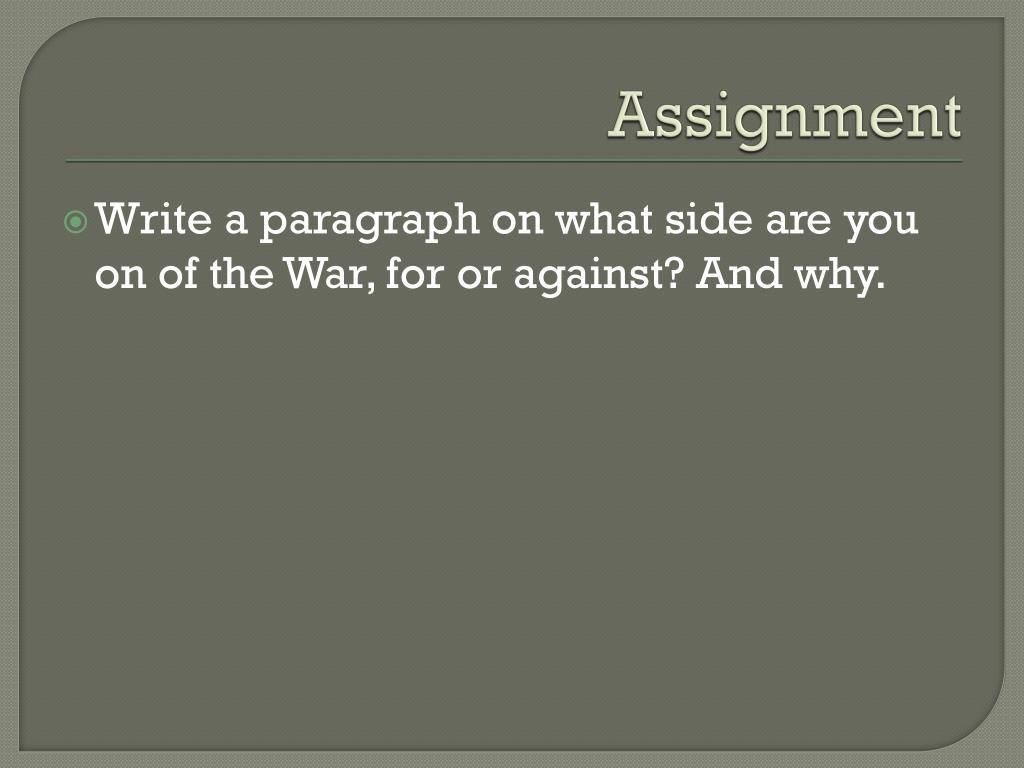 Assignment Write a paragraph on what side are you on of the War, for or against? And why.