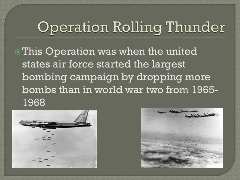 Operation Rolling Thunder This Operation was when the united states air force started the largest bombing campaign by dropping more bombs than in world war two from 1965-1968