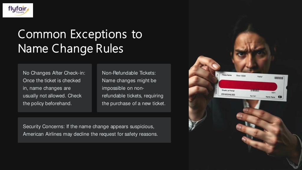 Common Exceptions to Common Exceptions to Name Change Rules Name Change Rules No Changes After Check-in: Once the ticket is checked in, name changes are usually not allowed. Check the policy beforehand. Non-Refundable Tickets: Name changes might be impossible on non- refundable tickets, requiring the purchase of a new ticket. Security Concerns: If the name change appears suspicious, American Airlines may decline the request for safety reasons.